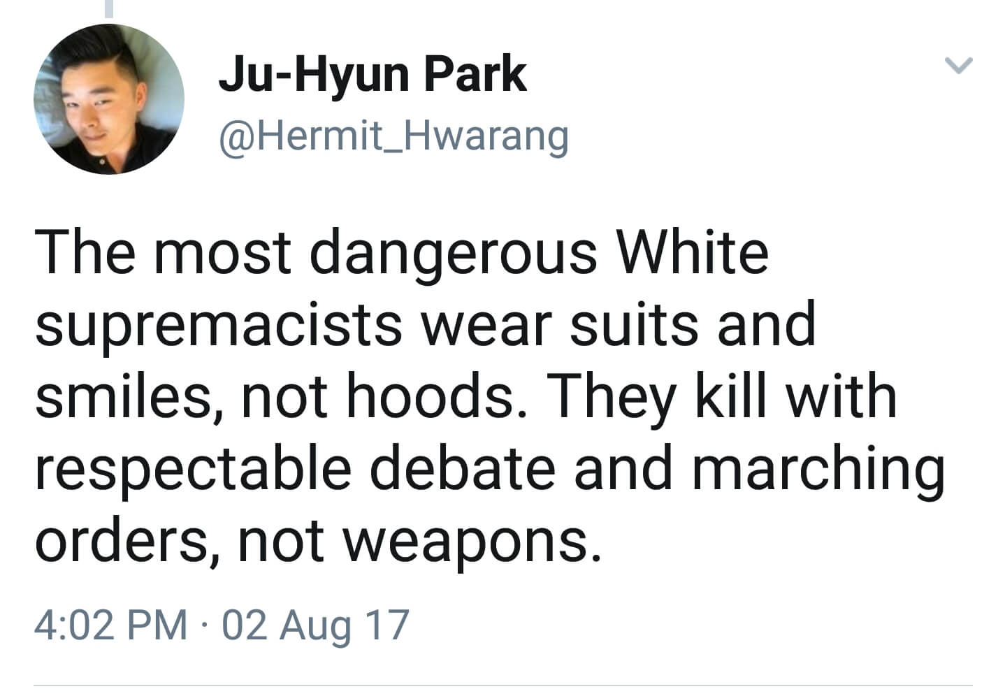 The most dangerous White supremacists wear suits and smiles, not hoods. They kill with respectable debate and marching orders, not weapons. – Ju-Hyun Park